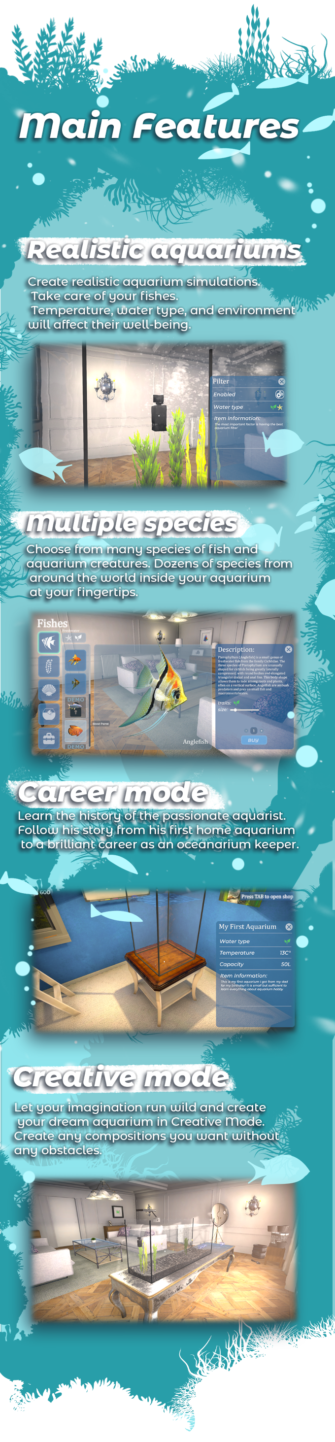 Create and observe Aqua World! Learn more about fish and their behavior and take responsibility for their lives. Control the temperature, environment, and nourishment to provide a suitable environment. Don’t forget to develop your aquarium and after a while, you will be able to open an aquarist shop!