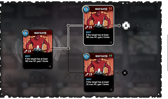 Cards don’t just get better. Each card upgrade comes with a difficult strategic choice between two upgrades. Choose wisely, depending on your deck and playstyle.A powerful bonus but only for the round? Or the same bonus but for the whole fight? Two different paths...