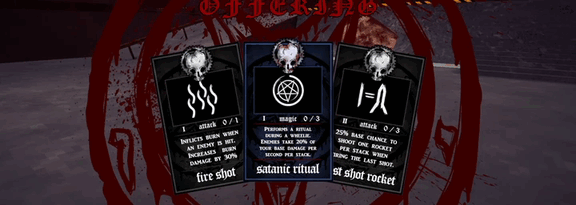 Demonic Offerings come in the form of cards. Build your deck by choosing the right cards for your build. Unlock new cards for later runs to be prepared for the horrors Motördoom has to offer.